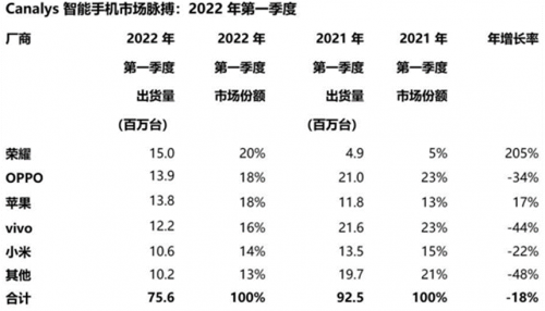 2022年第一季度中国大陆手机出货量资料来源:Canalys