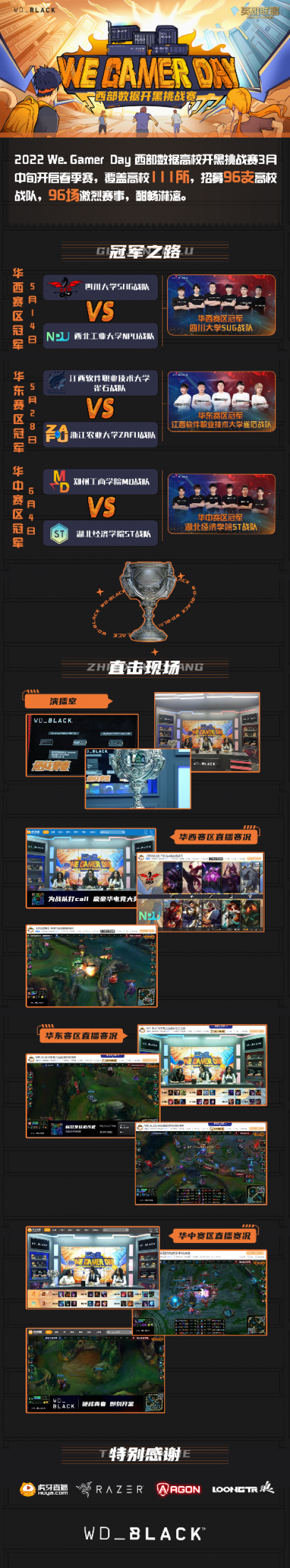 We. Gamer Day西部数据开黑挑战赛是由英雄联盟官方授权,西部数据旗下游戏品牌WD_BLACK打造的高校电竞赛事,2022新赛季新模式强势开团。自3月21日,春季赛率先在华西赛区、华东赛区以及华中赛区的111所高校启动,热血招募了96支战队,经过93场选拔赛和3场大区决赛的激烈争夺,最终3支战队——四川大学SUG战队、江西软件职业技术大学雀石队、湖北经济学院ST战队成功脱颖而出,分别获得三大赛区的冠军,接下来,他们将继续冲刺年度总冠军。