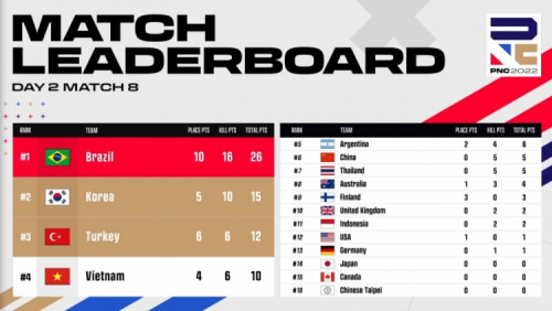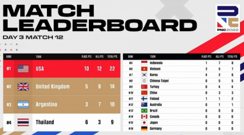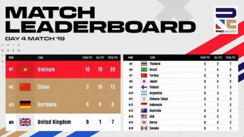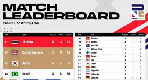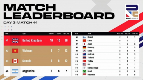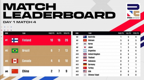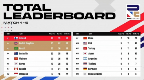 第五局比赛,地图为米拉玛。四阶段,中国大陆队淘汰掉英国队后仅存两人,还没来得及庆祝就在进圈路上被一颗手雷淘汰出局。决赛圈,芬兰队先手淘汰掉加拿大队,同时越南队淘汰掉澳大利亚队后与芬兰队决战,最终芬兰队拿下越南队再吃一鸡。本日积分榜如下: