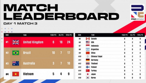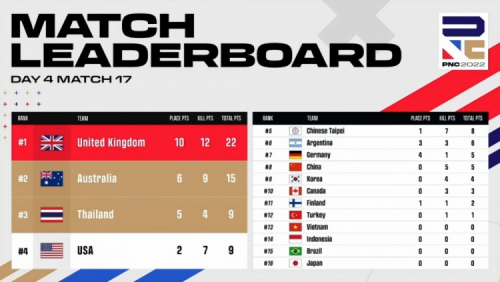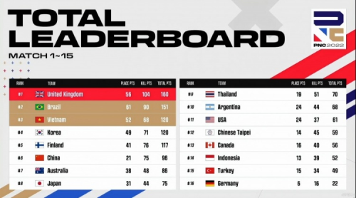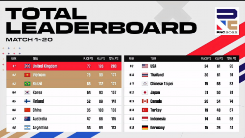 【Krafton Inc.旗下PUBG工作室】英勇竞生,绝地六势!为期四天的2022PNC全明星赛已落下帷幕。经过全球各赛区16支明星代表队的激烈角逐,2022PNC全明星赛冠军桂冠花落英国队(即代表队,后文同)——以总分203分、126个淘汰数领跑积分榜;越南队以总分177分、99个淘汰数拿到亚军;巴西队则以稍弱的地区分,结合总分177分、112个淘汰数,拿到季军;中国大陆队在最后一天单局拿下八个淘汰数,成功吃鸡展现英勇不屈的精神,最终拿到本次比赛第六名;中国台湾队则是排在第十一名的位置。下面让我们来回顾一下本周的精彩战况: