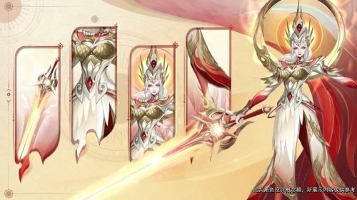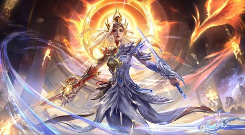 日像出现,神女身上盔甲变幻,如烈日当空神辉激荡。玄鸟合二为一化作一柄大剑,神女手握重剑,一斩劈开混沌,自此天朗气清,纷乱平息。