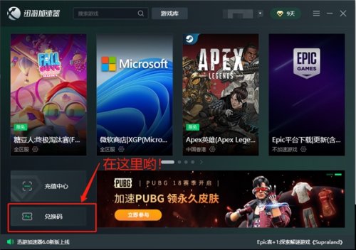 这里给大家提供一个免费获得加速器的方法:首先记住这个口令【糖豆人111】,然后在网上下载迅游加速器,打开客户端!找到左下角兑换码窗口。