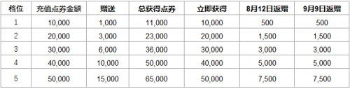 召唤师在活动页面充值后,可分两期获得赠送点券,具体充值和返利金额如下: