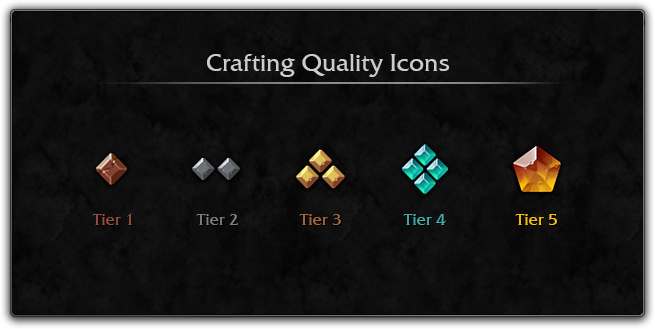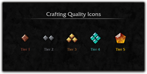 此外,并非所有采集材料都有品级。主要采集专业技能采矿、剥皮和草药学采集到的核心材料都具有品级,主要专业技能制作的材料也具有品级。其他材料,例如所有人都能采集的肉、布、鱼和元素,则不会具有品级。