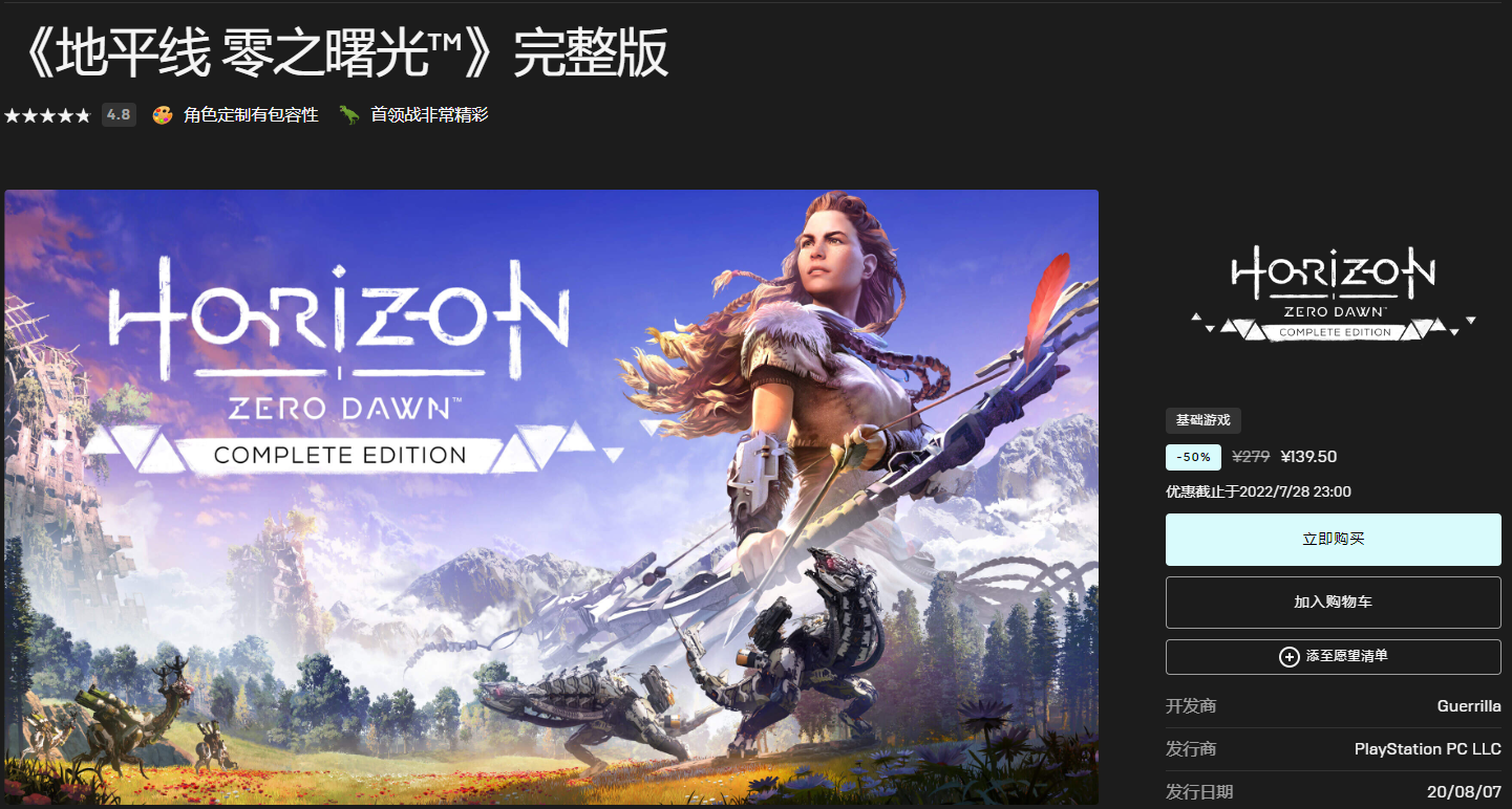 《地平线:零之曙光》5折优惠,售价139.5元