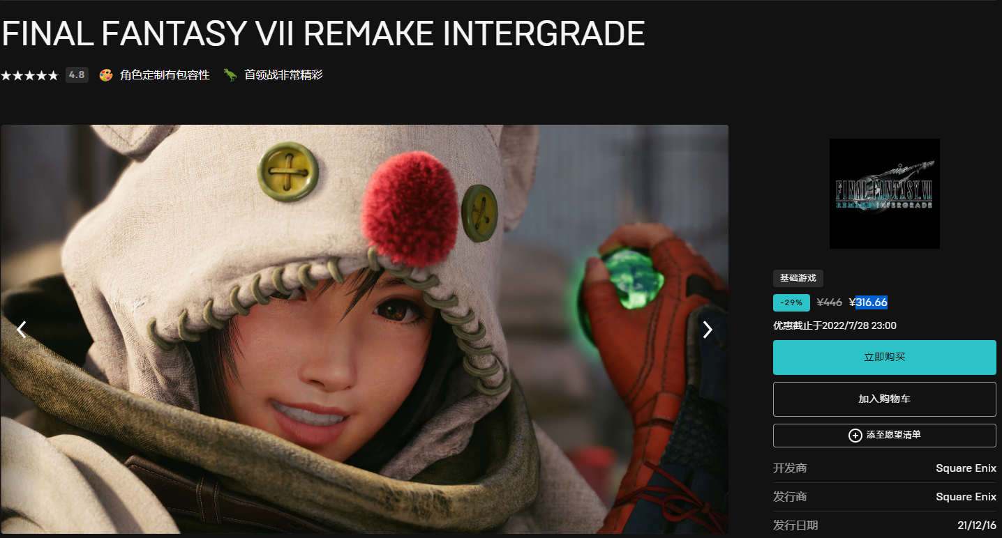 《最终幻想7:重制版Intergrade》29%off,售价316.66元