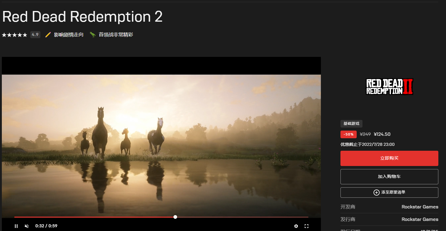 《荒野大镖客:救赎2》5折优惠,124.5元。