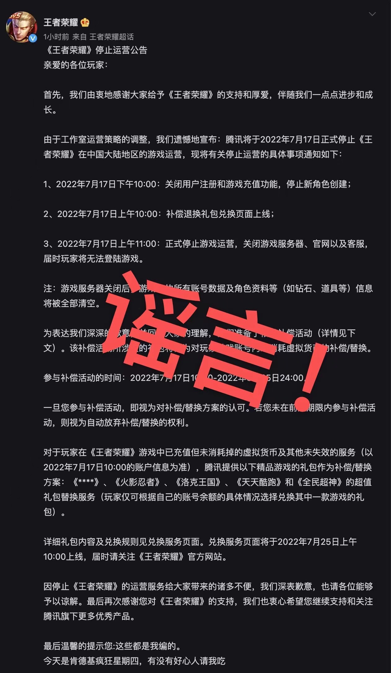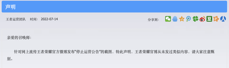 针对网上流传王者荣耀官方微博发布“停止运营公告”的截图,特此声明,王者荣耀官博从未发过类似内容,请大家注意甄别。