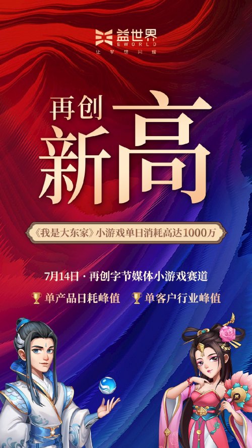 7月14日,益世界小游戏消耗再创新高 ,《我是大东家》小游戏单日消耗高达1000万。