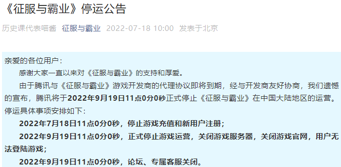 由于腾讯与《征服与霸业》游戏开发商的代理协议即将到期,经与开发商友好协商,我们遗憾的宣布,腾讯将于2022年9月19日11点0分0秒正式停止《征服与霸业》在中国大陆地区的运营。停运具体事项安排如下: