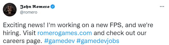 John Romero的新工作室“Romero Games”现在为该项目招募开发者,目前该项目尚处于非常早期的阶段,因此还无法分享其他消息,但他透露本作将为全新IP,且会与某家大型发行商合作开发。