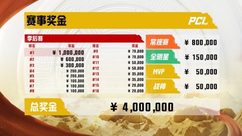 本次夏季赛总奖金高达400万人民币,其中包括常规赛周决赛排名奖金80万人民币(周决赛排名前三名分别为10万,8万,2万)、全明星赛奖金15万人民币、季后赛排名奖金295万人民币(季后赛第一名可获得100w,第二名60w,第三名30w,第四和第五名各得20w,奖金按照排名递减,垫底的队伍也可以拿到保底的2w元奖金)。此外还设立个人奖项MVP和战神奖金分别5万人民币。