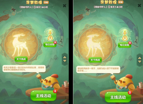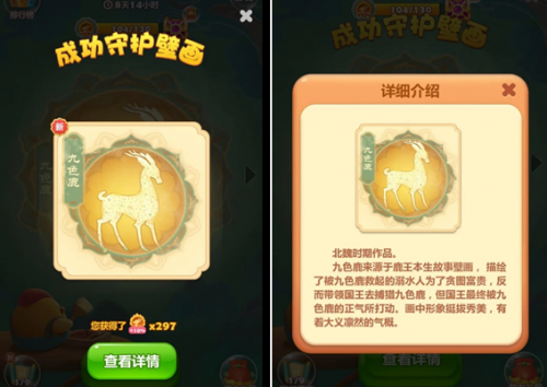 此外,玩家在活动中修复的瑞兽壁画,包含九色鹿、卧座白狮、翼马等九大瑞兽,均复刻了敦煌壁画中的神兽形象。而且在每张瑞兽壁画修复完成后,会弹出对应瑞兽的作品介绍,让玩家真正感受到敦煌文化背后的故事。