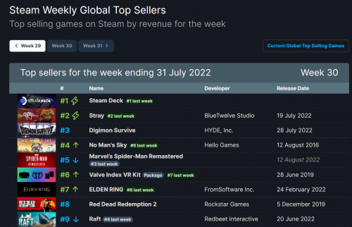 V社公布了上周(2022年7月25日至7月31日)Steam的销量排行。榜单第一名依旧是V社掌机Steam Deck,这已经是该掌机霸榜的第九周。第二名也没发生变化,依旧是猫咪冒险游戏《流浪》,新作《数码宝贝:绝境求生》获得了第三名,下面就来看看详细榜单吧。