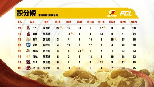 周决赛,17战队表现出强劲的得分决心和部署:第四局七阶段,场上存在四支队伍进行混战,LEGGFY战队淘汰掉4AM战队残编后,17战队闪电出击,将LEG、GFY战队三人淘汰后,面对XLG战队独狼轻松拿下,以14个淘汰数吃鸡!第七局,17战队在七阶段在东部圈边与NH战队、CTG战队乱斗,队内shou选手先是击倒NH战队一员后,再接击淘汰CTG战队,此时17战队正面冲击NH战队,成功拿下比赛吃鸡!第十一局,八阶段17战队火力全开,在北部圈边淘汰WuK战队后,相继淘汰掉DDT战队和XLG战队,再下一鸡!最终17战队以135分领跑周决赛榜单,锁定首周周冠!