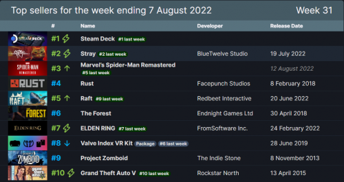 V社公布了上周(2022年8月1日至8月7日)Steam的销量排行。榜单的第一名依旧由V社掌机Steam Deck霸占,这已经是这款掌机霸榜的第十周。第二名也没有发生变化,还是猫咪冒险游戏《流浪》。第三名则是《漫威蜘蛛侠:复刻版》。下面就一起来看看详细排名吧。