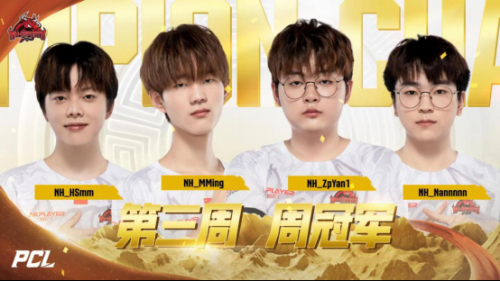 周决赛首日第三局六阶段,NH战队面对南部的混战,坐收渔翁之利,淘汰掉残编的DDT战队,随后的七阶段,NH战队在圈中心拉开枪线以合围之势淘汰KRG战队,拿到周决赛首鸡;第二日第五局八阶段,NH战队淘汰掉Tianba战队后进入决赛圈与DT战队SOLO。两支战队均是满编状态,但转瞬之间,NH战队展现默契配合以钳形攻势击倒DT战队三人,轻松拿下比赛。最终,NH战队以113分甩开第二名31分拿下本周周冠军!