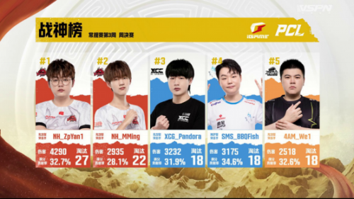 本周NH战队全员从开赛第一天就展现惊人的状态,并一直维持到周决赛:ZpYan1选手和MMing选手分别以4290、2935的惊人伤害值拿下一二名,特别是ZpYan1选手更是以27个淘汰数甩开其他选手获得本周战神的称号;XCG战队Pandora选手表现神勇,以18个淘汰数和3232的伤害值拿到战神榜第三;周亚军SMS战队功臣BBQFish选手则是以34.6%的得分贡献率位居第四;4AM战队的人气选手We1以2518的伤害值和18个淘汰数排在第五。