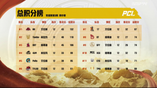 本周周中赛,各支豪强跻身榜单前列展开积分大战,力争头名晋级周决赛。NH战队在周中赛的战神榜竟现三人齐榜:MMing选手、Nannnnn选手、ZpYan1选手分别占据战神榜前三名,帮助队伍拿到132分一骑绝尘头名晋级周决赛;Tianba战队本周展现前所未有的状态,主动出击,以勇猛之姿从其它豪强手中夺得110分高居第二;DDT战队再次带给我们惊喜,以106分压过4AM战队排在第三,轻松直达周决赛;此外同样晋级的战队有PeRo战队、TYLOO战队、17战队和DT战队。