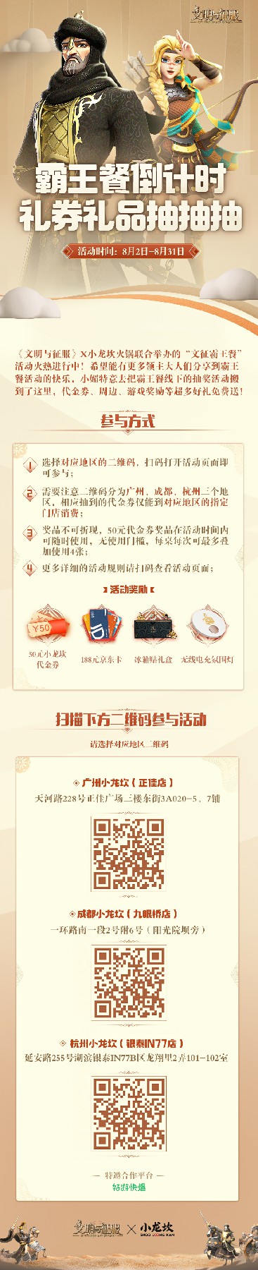 看了这些线下欢聚的照片,各位领主们是不是有“亿”点点心动呢?没能参与到线下霸王餐活动也不要失望,即日起至8月31日,选择下图中对应地区二维码,扫码即可参与抽奖,有机会领取小龙坎代金券(限广州/杭州/成都)、188元京东卡、游戏周边等豪礼!