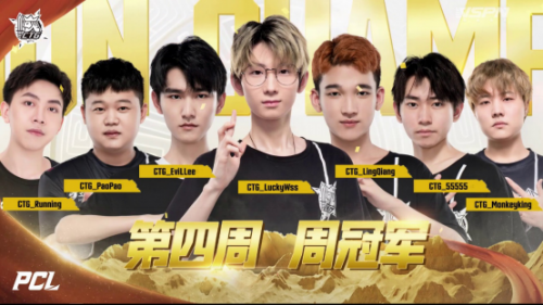 CTG战队在最后一周的比赛当中激流勇进,不因豪强争夺而胆怯,不因黑马拼抢而放松,稳住阵脚、步步为营最终拿下周冠:周中赛第二日第三局,CTG战队由于减员,潜心存活到决赛圈时,不料被满编的ACG战队围堵淘汰,憾失首鸡!第五局米拉玛小岛最后缩圈阶段,满编的CTG战队和KRG战队以及4AM战队三人迎来正面混战,混战中CTG战队利用山坡躲开枪线,先后淘汰4AM战队、KRG战队,成功拿下首鸡。最终,CTG战队以98分的总积分排在第二轻松晋级周决赛。