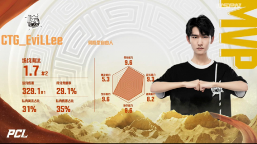 与此同时,本周CTG战队功臣EviLLee选手数据表现十分抢眼:得分能力和生存能力的评分高达9.6分;平均每场伤害值高达329.1,占队内伤害值三成;平均每场的淘汰数为1.7个,实为队内名副其实的大场面先生、CTG战队的得分利器!拿到本周的MVP可谓实至名归!