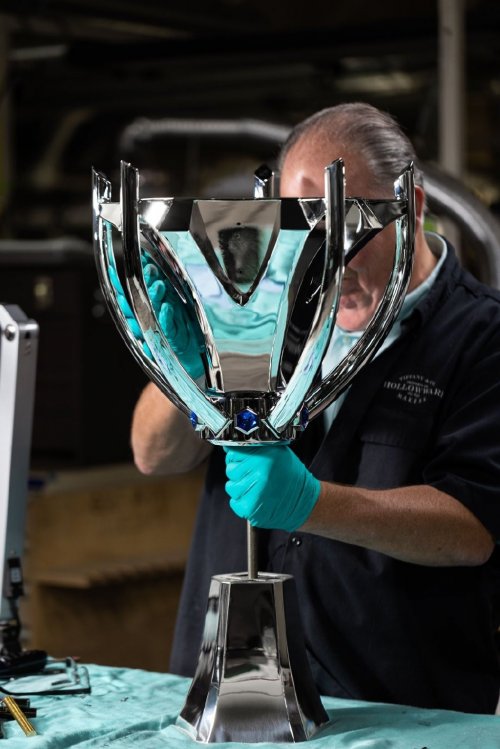 作为一款充满现代风格的作品,全新设计的召唤师奖杯不仅纪念着过往的辉煌,同时也象征着英雄联盟赛事新篇章的到来。召唤师奖杯的主要制作材料为纯银、细银、不锈钢、黄铜和木材,重约 20 公斤,高约 70 厘米。工匠们历时四个月,总计花费 277 个小时打造而成。除了历任获胜队伍和职业选手们的名字,象征召唤师峡谷5个位置的icon也被镌刻其上。