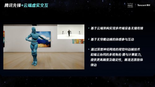 在虚实互动领域,腾讯先锋通过基于云端架构实现多端无缝衔接、通过深度神经网络的视觉AI动捕技术和云端协同的多视角拍摄与计算能力,精准还原肢体动作,让用户通过普通摄像头便可创造三维形象,在VR/AR世界实现云游戏与运动、健身、直播等场景的深度融合,让体验者在虚拟世界中“真实”交会,打破虚拟与现实的界限,获得更深入更沉浸式的体验。