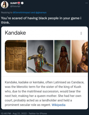 “我认为你们是害怕在你们的游戏中出现黑人。”@itssunpi指责道,她认为该角色受到了现实中努比亚人的启发,并贴出了相关资料图片。