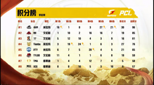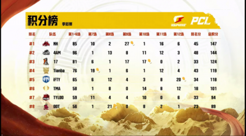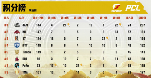 最终,NH战队凭借着高达312分的总积分甩开分差,一骑绝尘拿下季后赛冠军!Tianba战队一鼓作气反超4AM战队以270分位居第二;常规赛积分榜第一的17战队后来居上,以261分拿到季后赛季军: