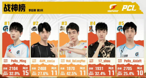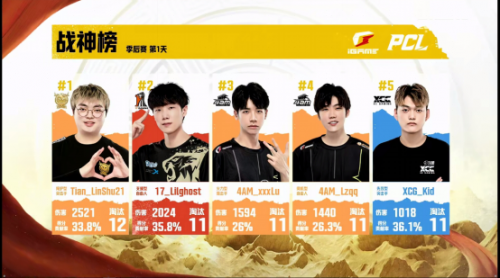 季后赛首日比赛,Tianba战队和4AM战队的战场让人大呼过瘾!4AM战队单日拿下三鸡,并以近四十个淘汰数拿下96分,登上首日的积分榜榜首!队内xxxLu选手和lzqq选手分别以26%和26.3%的得分贡献率稳坐4AM战队功臣宝座。Tianba战队状态火热,二连鸡拿下首日第四,特别是在第三局比赛中Tianba战队单局拿下了十四个淘汰数吃鸡;队内LinShu21选手以惊人的2521伤害值和33.8%的得分贡献率荣登首日战神榜榜首。