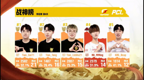 回顾本周季后赛选手们的表现,冠军队伍NH战队的MMing选手独挑大梁,以高达56个淘汰数、9152的伤害值获得本次季后赛的战神。亚军队伍Tianba战队两人上榜,分别是LinShu21选手和Cui71选手两人分别以49和46个淘汰数占据榜首第二和第四的位置;PERO战队的Aixleft选手在本周季后赛更是以近10000的伤害值排在第三名;人气选手ZpYan1选手以44个淘汰数和26%的得分贡献率,同样入围本次季后赛战神榜。
