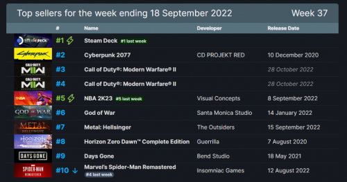 V社公布了上周(2022年9月12日至9月18日)Steam商店的销量排行。获得销量冠军的依旧是V社掌机Steam Deck,这款掌机已经十六连冠了。第二名是《赛博朋克2077》,该作因动漫《赛博朋克:边缘行者》的推出而再次火爆。第三和第四名是《使命召唤19:现代战争2》。
