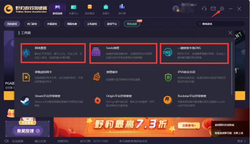 如果我们加速后依然发生上述等问题,可以进行【网络重置】、【Hosts清理】以及【修复本地DNS】。点击野豹游戏加速器设置图标,找到【工具箱】便可进行网络重置、Hosts清理、一键修复本地DNS!