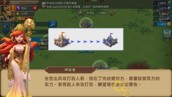 另外,你还可以在大地图上对对手进行侦查、进攻等战争行动,但需要特别注意的事:战争行为会导致领地护盾消失并进入一段时间的战争狂热状态(狂热状态不可开启护盾),也会成为别人的攻击对象,所以前期大家狂热需谨慎!