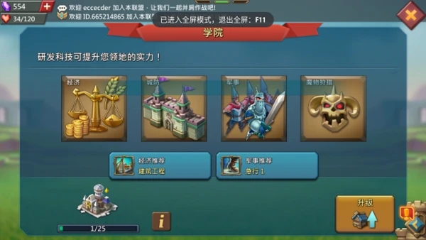 建筑学院后,可以研发各项实用科技,前期建议研发经济、军事和猎魔。系统也会有推荐的科技让我们去研发。