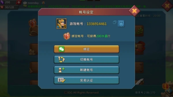 为了避免账号丢失,小编建议大家在齿轮设置的账号设定中,绑定自己的微信或者苹果账号,不仅不容易遗忘,首次绑定后还可以获得额外的水晶奖励,总之,绑就完事了。