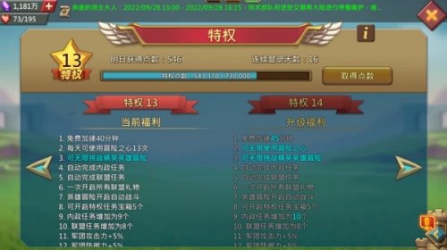 《王国纪元》的特权福利还是比较有性价比的,大家可以点击头像上的特权查看自己的特权等级。我们可以通过每日登录、联盟商店等方式积攒特权点数,提升特权等级,解锁更高级福利。当然,你也可以用游戏水晶,直接提升特权等级,以下是比较值得解锁的核心权益推荐: