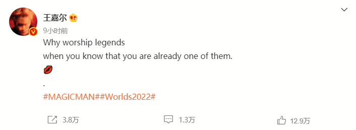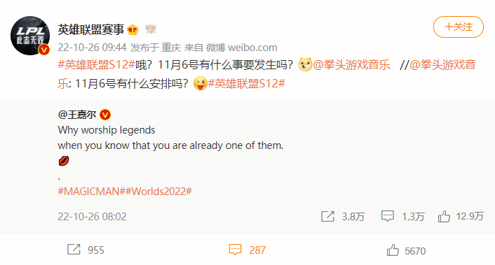 今天歌手王嘉尔在个人微博上发文写道:“为什么崇拜传奇,当你知道你将成为其中一员时”。并加上了#MAGICMAN#和#Worlds2022#的标签。随后英雄联盟赛事等官方账号转发了该微博:“哦?11月6号有什么事要发生吗?”。这波似乎是在暗示王嘉尔将在11月6日的S12决赛活动上亮相。