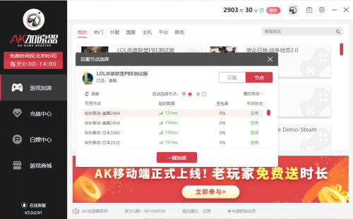 出现lol美测服无法连接至会话服务,大部分原因是由于玩家网络不稳定、本地网络差的问题导致。玩家可以使用AK加速器,搜索pbe进行加速,可以帮助玩家优化网络连接。也可以切换加速网络延迟较低的节点进行加速。