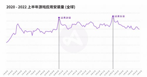 让我们一起看看移动游戏在Q5的最新数据。2020和2021年,全球游戏应用的安装量高峰都出现在12月,而2021年1月和2022年1月则在当年安装排行榜中名列第二。