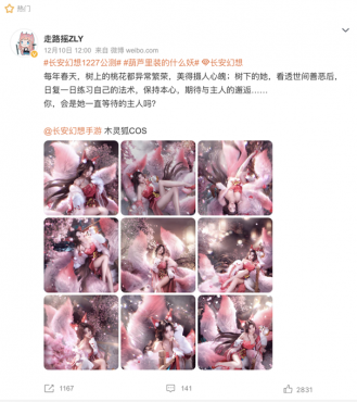 首发当日,全平台公布了代言人宋轶唐风TVC大片《我在长安等你》,仅靠这条内容,就冲上了微博热搜榜第15名,话题“葫芦里装的什么妖”引发热烈讨论,相关话题总阅读量突破6亿,相关微博转赞评达到4万。众多画师、Coser纷纷下场,发布专业作品吸引了众人眼光,其中画画的慕白、眠狼、清风澈、晓泊21等人气画师基于游戏内容创作了许多同人美术作品,而矮乐多Aliga、走路摇ZLY 、w百合欧皇子w等知名coser也发布了游戏角色的cos装扮,塑造了妖媚的九尾狐、可爱的花楹、活泼的小书灵等形象,称作是“漫撕女”也不为过。与此同时,长安幻想手游官号下场,多番互动,协助游戏斩获微博游戏榜第一的成绩。