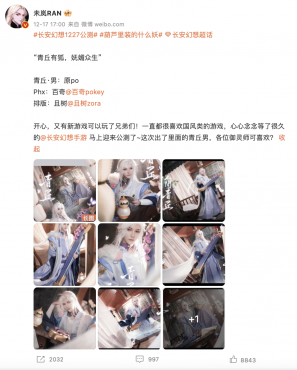 《长安幻想》首发时期的营销也抓住了妖灵这个核心,打造出了“妖灵不夜城”以及“葫芦里装的什么妖”两个核心卖点,以此作为二创切入点,在多个平台共同发力,制造刷屏效果。微博上,官方与宋轶达成合作,通过品牌TVC的宣传以及艺人团队、明星粉丝的助力,引发大量关注。各专业领域的达人也纷纷下场,通过画作、角色Cos等二创作品,深化游戏宣传卖点。最终斩获微博游戏榜第一的成绩。