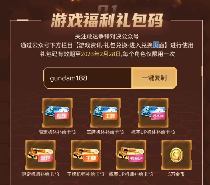 即将迈入兔年,《敢达争锋对决》6.0版本也将重磅上线,全新游戏内容更新,超人气机体登场,更有大波活动纷至沓来。此外,官方近期更为大家准备了庆典礼包码【gundam188】,指挥官们可在《敢达争锋对决》官方微信公众号下方栏【游戏资讯-礼包兑换-进入兑换页面】输入进行使用。使用过礼包码的指挥官还有机会抽取高达模型大礼包!中奖信息将通过游戏内邮件进行联络,请注意查收。