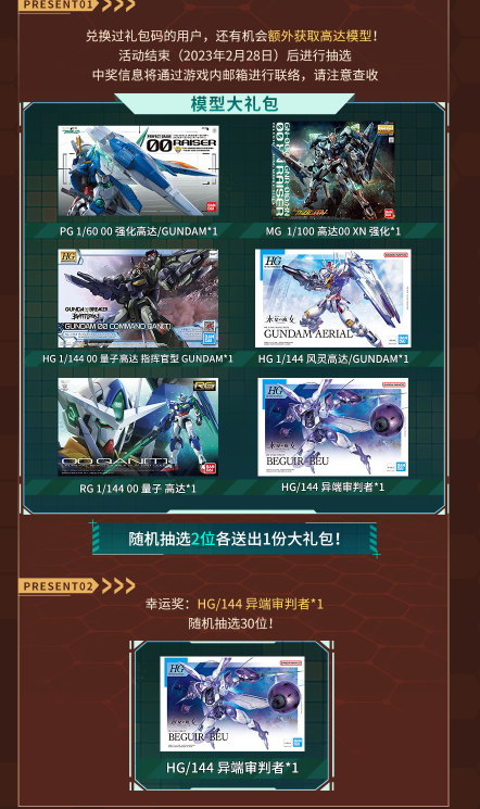此外,1月17日-2月19日之间,还有海量活动等你参加:如动画画“水星的魔女”机体【异端审判者】首次亮相(2.1开启)、机体载入—【沙漠敢达EW(犰狳装备)】送送送,以及新年、元宵、情人节等特别活动,福利满满!