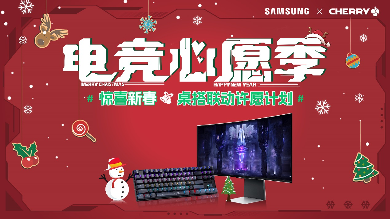 圣诞节和元旦是西方最重要的节日,相当于我们的春节,圣诞节和元旦因为隔得很近,又称之为“双旦”。在圣诞节时人们会希望送出礼物,表达对亲密的人的美好祝愿,元旦则是新的一年的开始,一年之计在于春!在双旦期间CHERRY x SAMSUNG开启联合心愿活动——电竞心愿季,联合微博、B站、抖音、小红书等平台,送出双旦氛围满满的电竞设备组合,超酷的电竞设备不但是最令人心动的礼物,也助力玩家们完成新年愿望!