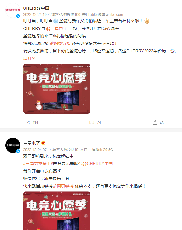 在圣诞节即将到来之时,@CHERRY中国和@三星电子官微在微博发布电竞心愿季活动,转发活动微博留下圣诞心愿,最终各抽取幸运用户送出精美礼品。同时,用户们在微博发起 #电竞心愿季# 话题,粉丝通过截图gif截出明年将会达成的电竞心愿,带图评论或者转发,即有机会获得电竞心愿大礼包。