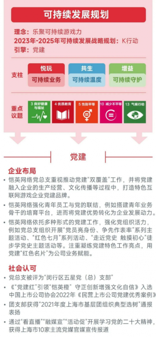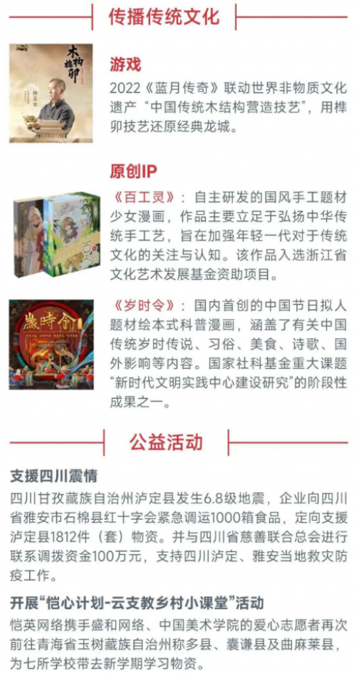 本年度,恺英网络的社会责任布局出现了较为明显的转型升级:一方面,企业将相对分散的履责事件梳理为更成体系的可持续发展规划,现阶段已发布可持续发展理念“乐聚可持续游戏力”,提出可持续发展行动“K行动”,并明确企业关注的重点议题,以及实现规划的支柱能力。另一方面,围绕上述规划,企业不断加码在细分领域的布局力度,党建方面,企业将党建作为履责引擎,组织开展“党员亮身份、争先作表率”“红色七月”“走近党史 触摸初心”等多项系列活动,现阶段已获得较多社会认可,例如恺英网络党总支被评为闵行区五星党总支、党建案例入选中上协2022年《民营上市公司党建优秀案例》;传播传统文化方面,企业依托文化产品深度还原中国文化并孵化原创IP,而在用户重视精品内容的文化产业发展趋势下,深度还原文化内容也有助于延长IP生命周期,进而成为企业依托IP履责的重要支点;公益方面,恺英网络布局较多,例如乡村教育、生态保护、灾难救助等,同时部分项目的布局时间较长,例如连续三年开展的 “云支教乡村小课堂”在线授课计划;“游戏+”方面,企业加码“游戏+医疗”,现有布局主要关注脑疾病患者的生命质量。