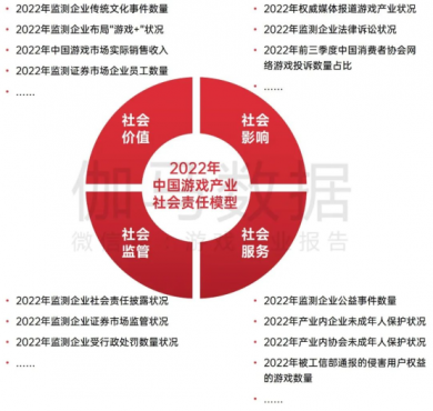 伽马数据依据模型评选出部分本年度“社会责任表现突出企业”。模型构建上,伽马数据从社会价值、社会影响、社会监督、社会服务四个维度构建企业社会责任评估模型,企业模型的维度选取与产业模型一致,仅在具体考核项目上进行调整。