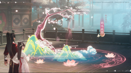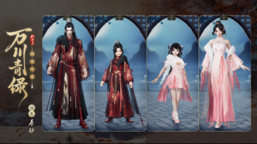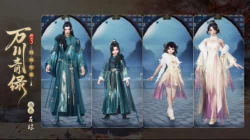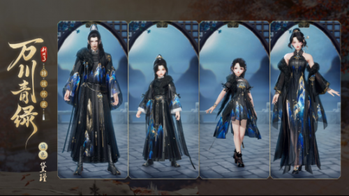 迟日江山,泥融飞燕,全新特效外装“万川青绿”沐春而来!大胆泼墨与细致笔画共同勾勒瑰丽山水,春燕飞掠,层峦纵横!开启服饰特效后侠士将有星光侧伴萦游,燕羽飘落纷纷,万川春意皆归山河人间,与诸君共赏!